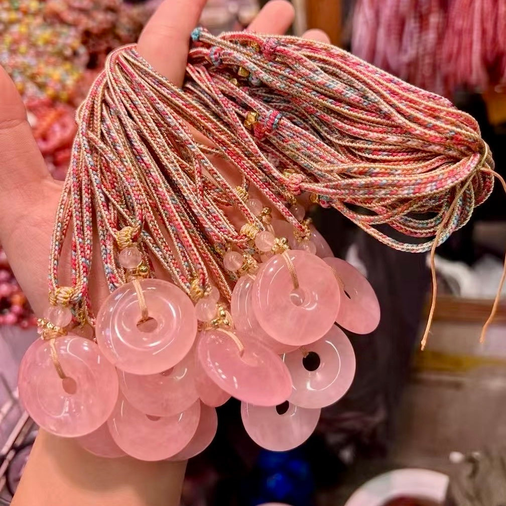 This beautiful piece features a genuine rose quartz donut pendant, carefully selected for its vibrant color.. The pendant is strung on a durable and stylish rope, creating a unique and eye-catching look. The combination of the rose quartz and the donut shape adds a touch of elegance and spiritual significance, perfect for those seeking a unique piece of artisan jewelry.